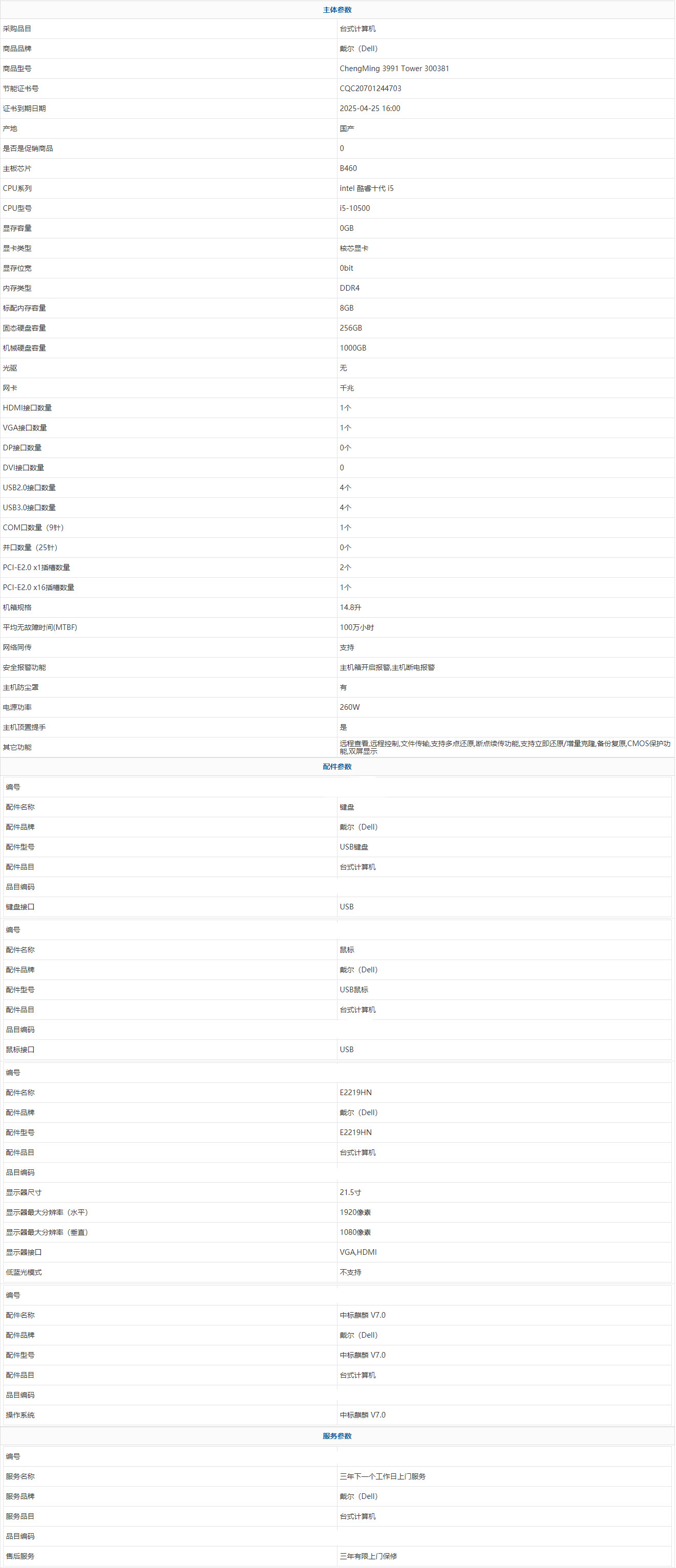 - 商品名稱:戴爾(Dell) ChengMing 3991 Tower 300381 intel 酷睿十代 i5 i5-10500 8GB 1000GB 256GB 中標麒麟 V7.0 21.5寸 三年有限上門保修