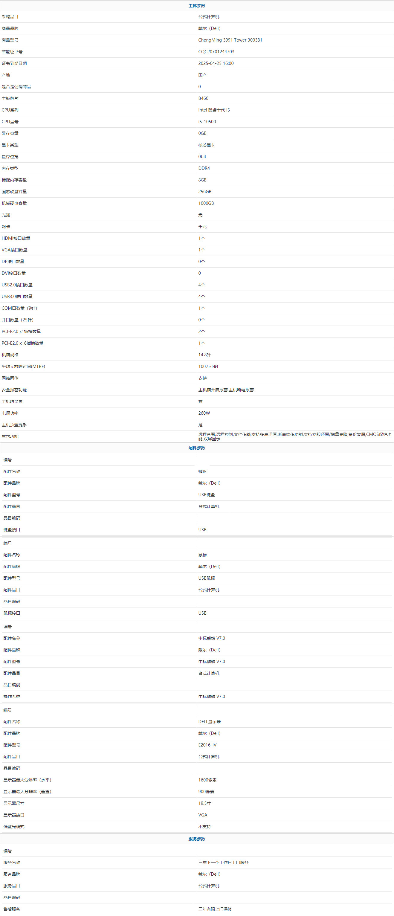 - 商品名稱:戴爾(Dell) ChengMing 3991 Tower 300381 intel 酷睿十代 i5 i5-10500 8GB 1000GB 256GB 中標麒麟 V7.0 19.5寸 三年有限上門保修