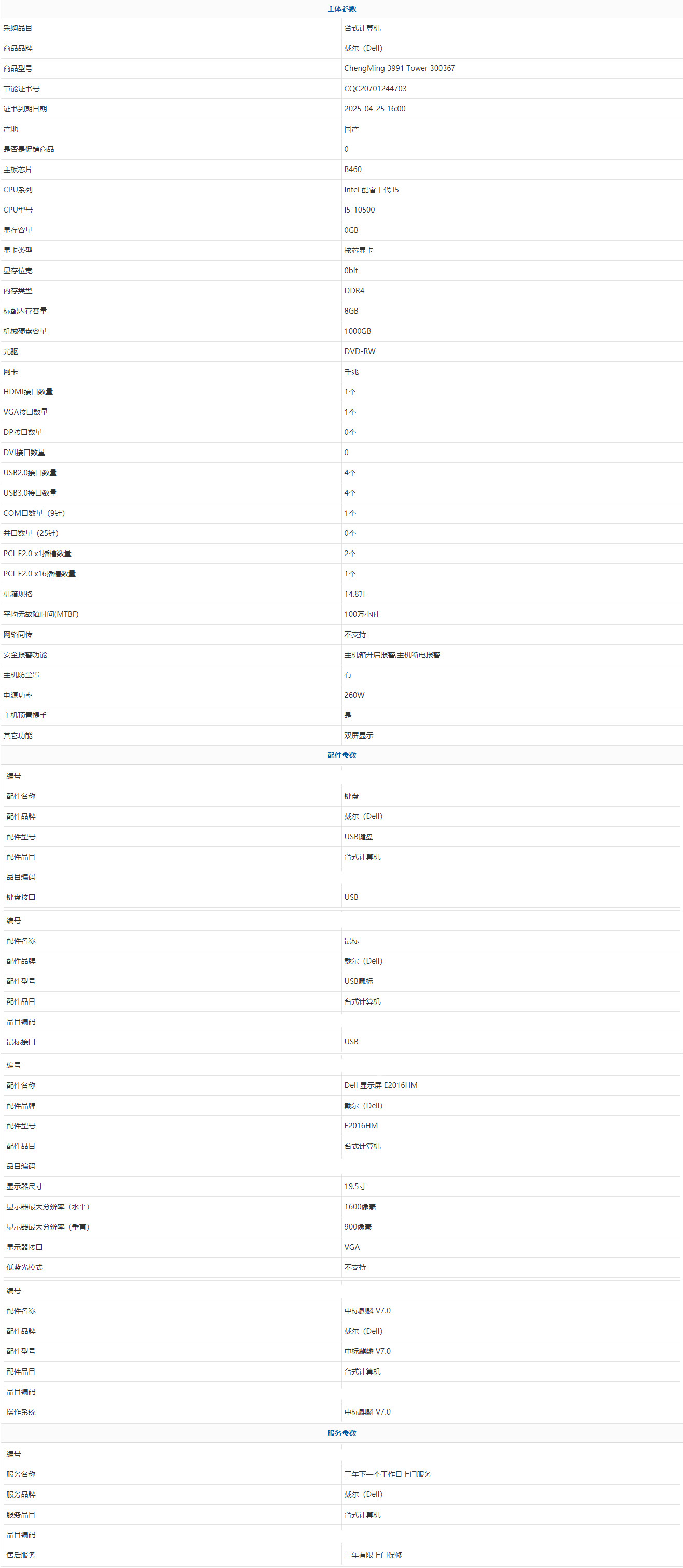 - 商品名稱:戴爾(Dell) ChengMing 3991 Tower 300367 intel 酷睿十代 i5 i5-10500 8GB 1000GB 中標(biāo)麒麟 V7.0 19.5寸 三年有限上門保修