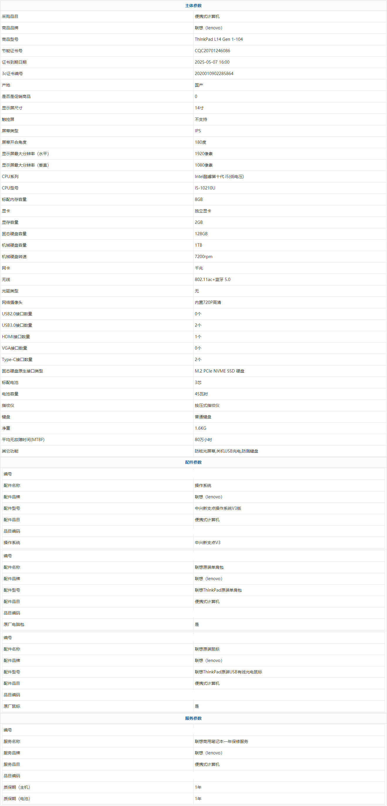 • 商品名稱:聯(lián)想(lenovo) ThinkPad L14 Gen 1-104 Intel酷睿第十代 i5(低電壓) I5-10210U 8GB 1TB 128GB 中興新支點(diǎn)V3 14寸 1年