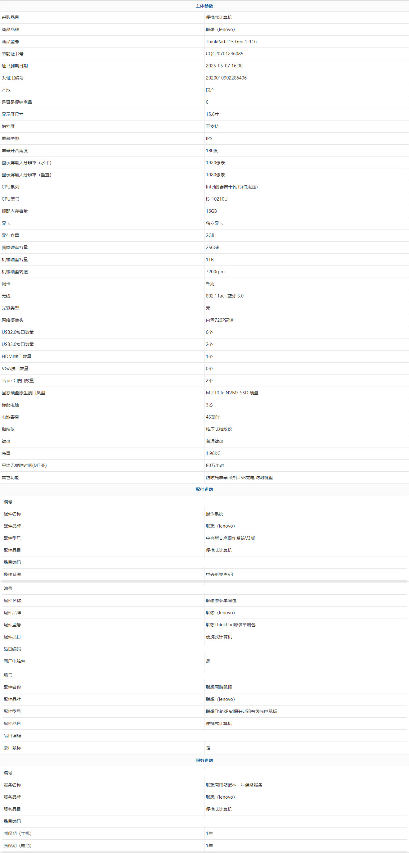聯(lián)想(lenovo) ThinkPad L15 Gen 1-116 Intel酷睿第十代 i5(低電壓) I5-10210U 16GB 1TB 256GB 中興新支點(diǎn)V3 15.6寸 1年