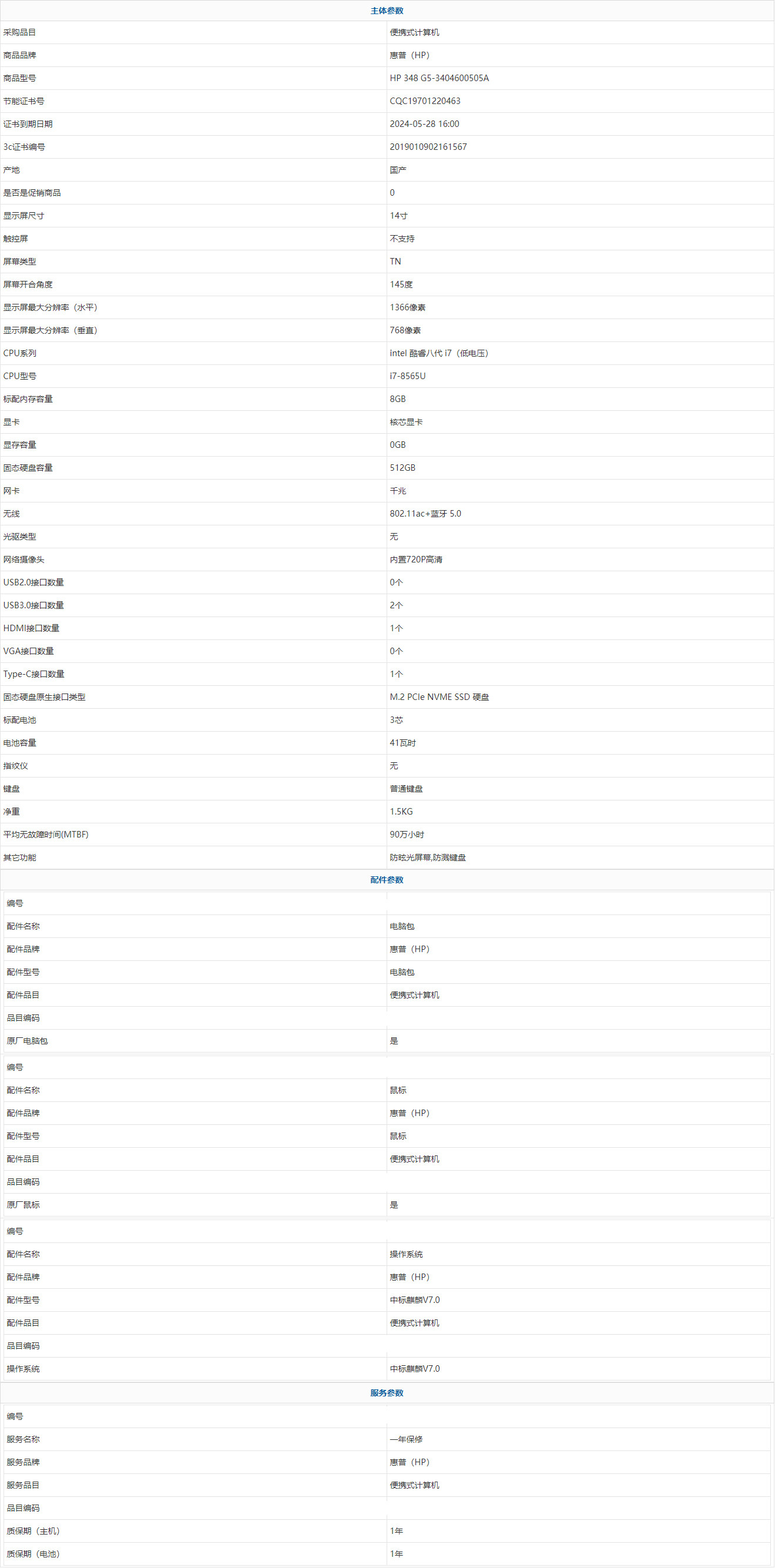 惠普(HP) HP 348 G5-3404600505A intel 酷睿八代 i7(低電壓) i7-8565U 8GB 512GB 中標(biāo)麒麟V7.0 14寸 1年