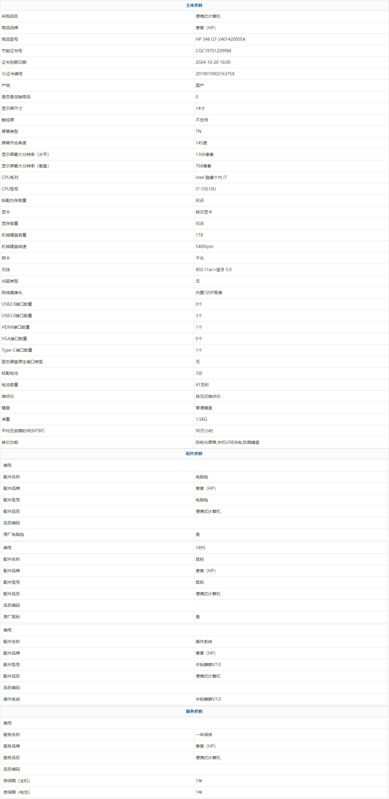 - 商品名稱:惠普(HP) HP 348 G7-2401420005A intel 酷睿十代 i7 i7-10510U 8GB 1TB 中標麒麟V7.0 14寸 1年