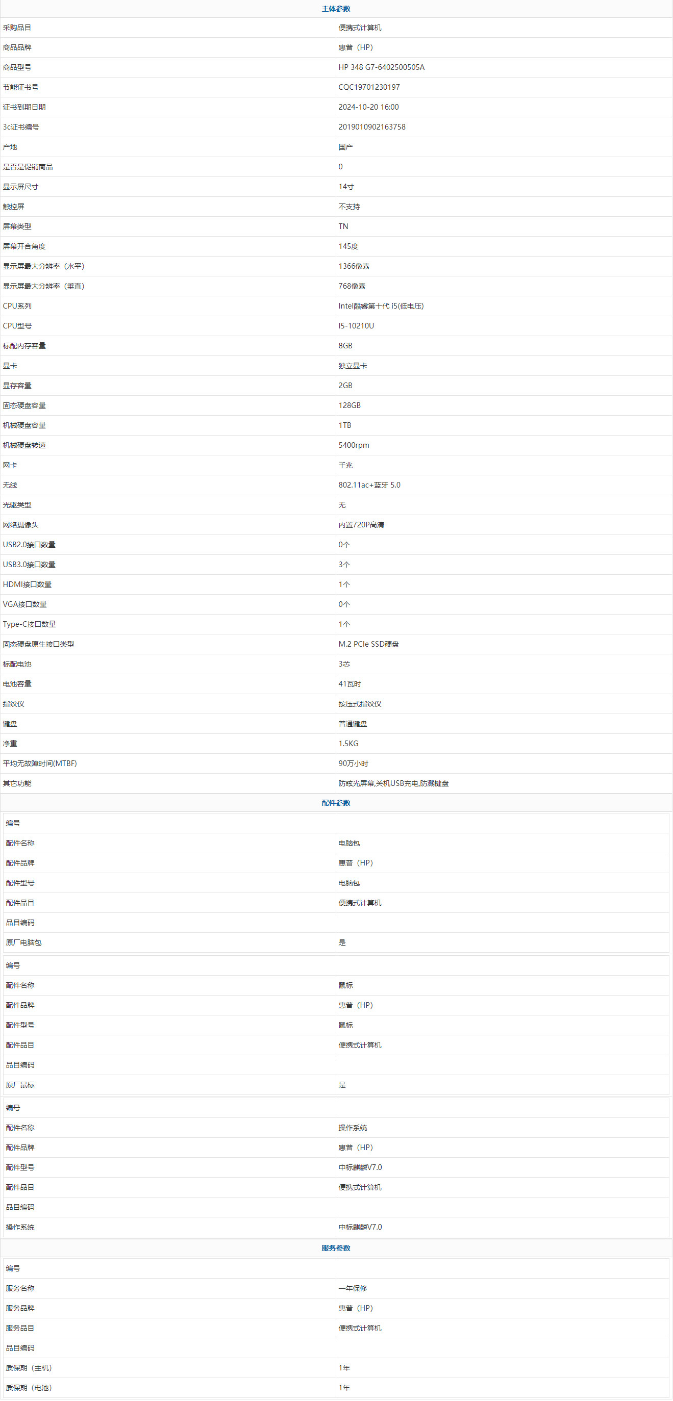 惠普(HP) HP 348 G7-6402500505A Intel酷睿第十代 i5(低電壓) I5-10210U 8GB 1TB 128GB 中標(biāo)麒麟V7.0 14寸 1年