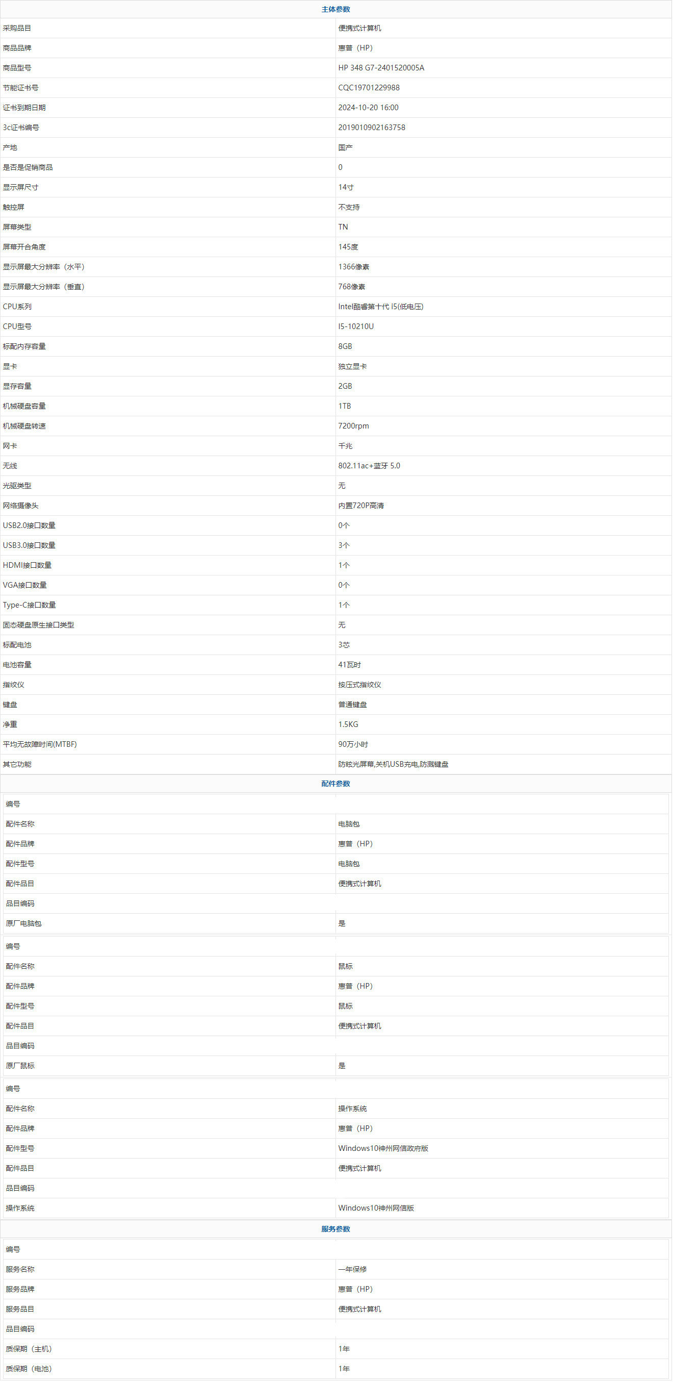 - 商品名稱:惠普(HP) HP 348 G7-2401520005A Intel酷睿第十代 i5(低電壓) I5-10210U 8GB 1TB Windows10神州網(wǎng)信版 14寸 1年