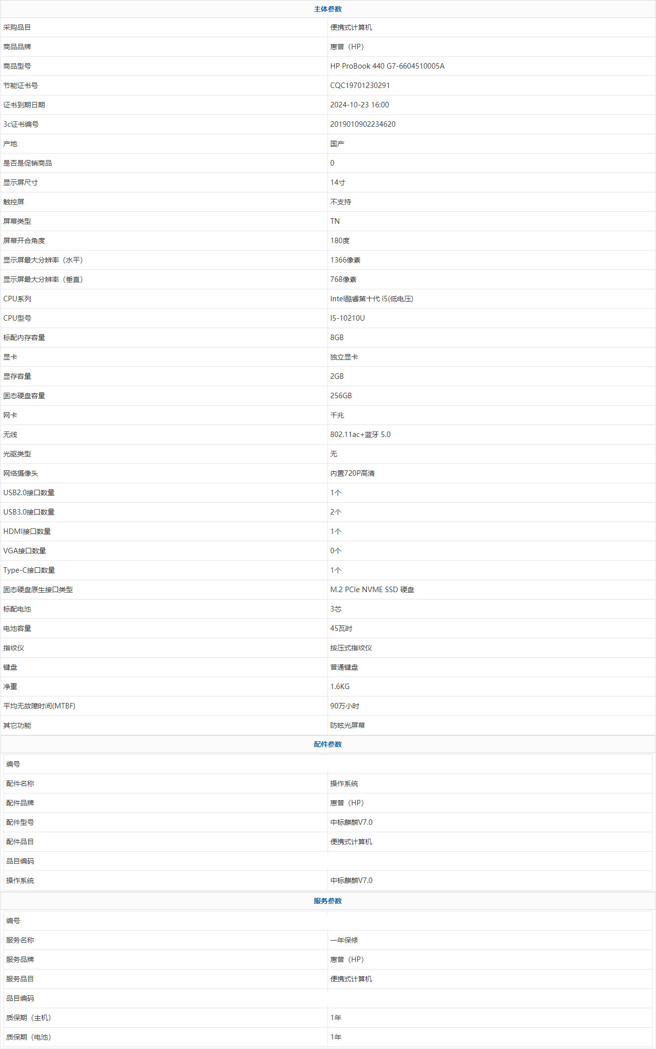 - 商品名稱:惠普(HP) HP ProBook 440 G7-6604510005A Intel酷睿第十代 i5(低電壓) I5-10210U 8GB 256GB 中標(biāo)麒麟V7.0 14寸 1年