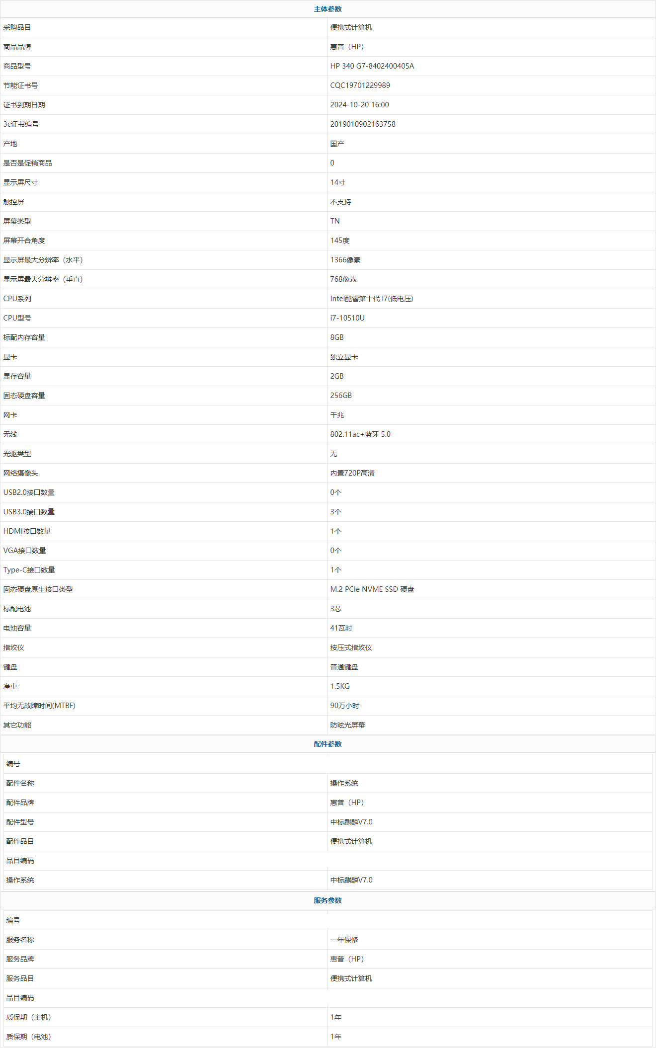 • 商品名稱:惠普(HP) HP 340 G7-8402400405A Intel酷睿第十代 i7(低電壓) i7-10510U 8GB 256GB 中標(biāo)麒麟V7.0 14寸 1年