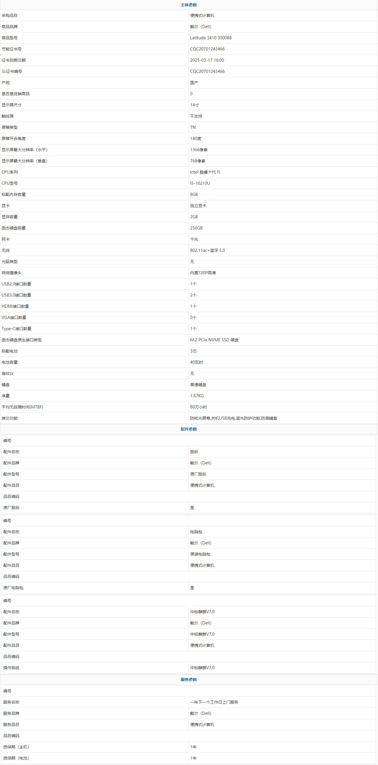 - 商品名稱:戴爾(Dell) Latitude 3410 300088 intel 酷睿十代 i5 I5-10210U 8GB 256GB 中標(biāo)麒麟V7.0 14寸 1年