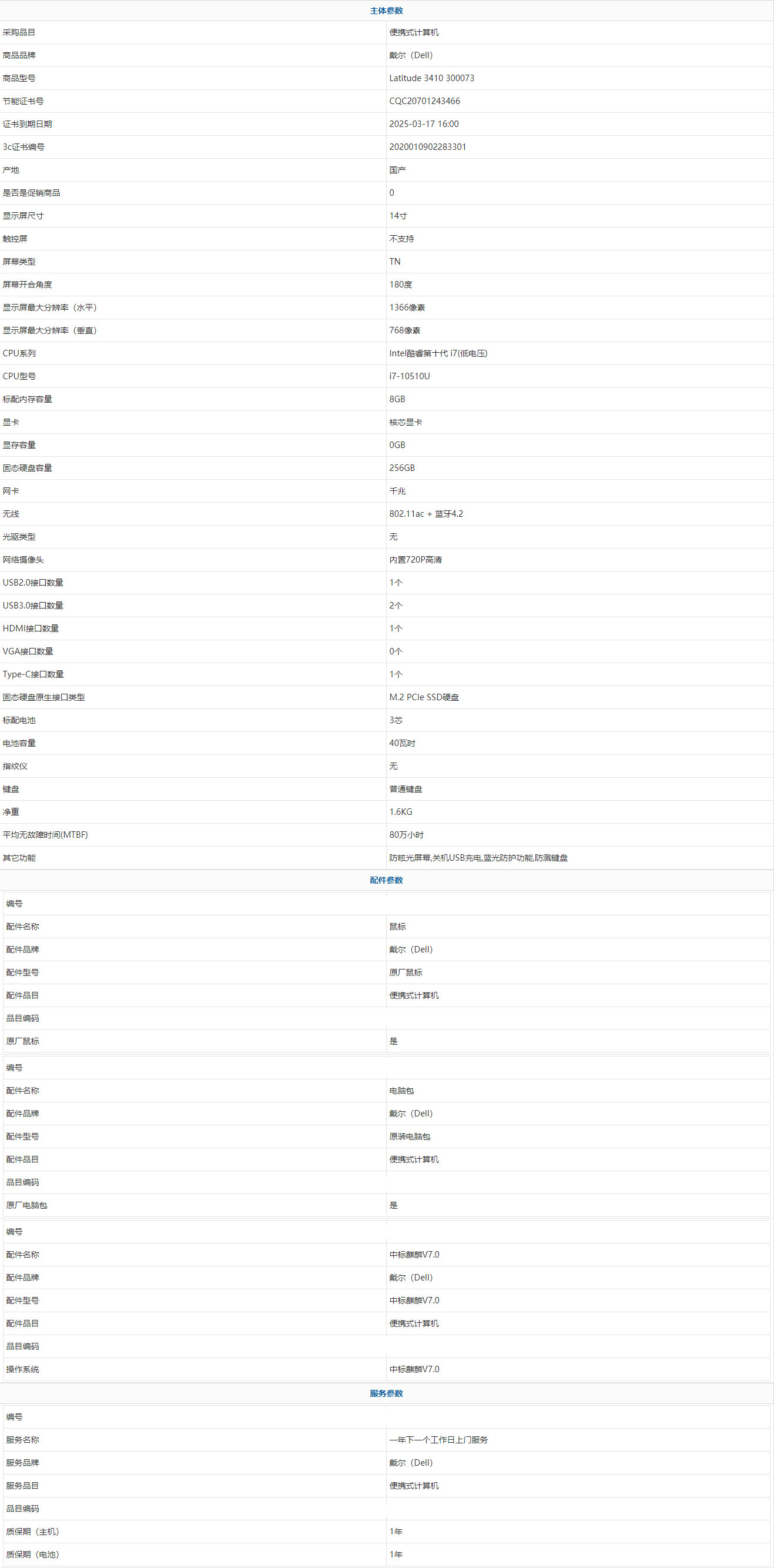 - 商品名稱:戴爾(Dell) Latitude 3410 300073 Intel酷睿第十代 i7(低電壓) i7-10510U 8GB 256GB 中標(biāo)麒麟V7.0 14寸 1年