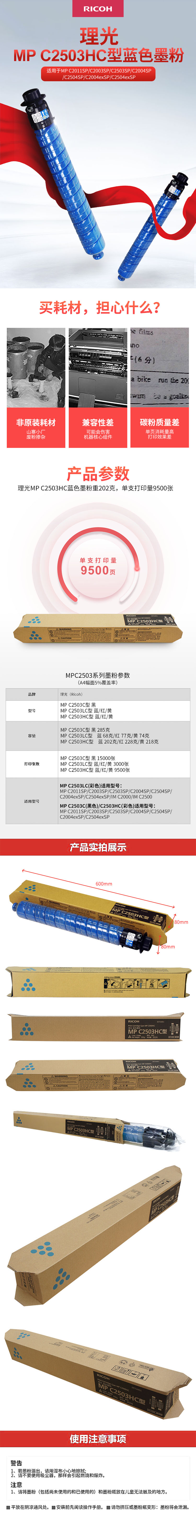 • 商品名稱:理光(RICOH)MP C2503HC型藍(lán)色墨粉盒 印量約9500頁