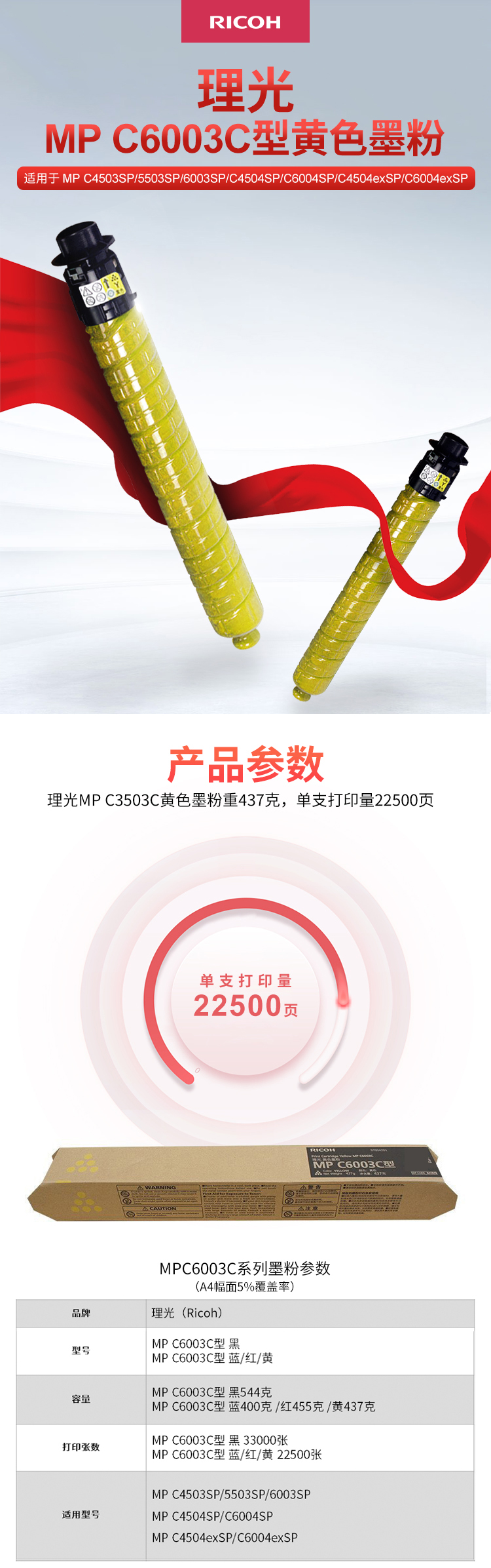 • 商品名稱:理光(RICOH)MPC6003C型黃色碳粉盒 印量約22500頁