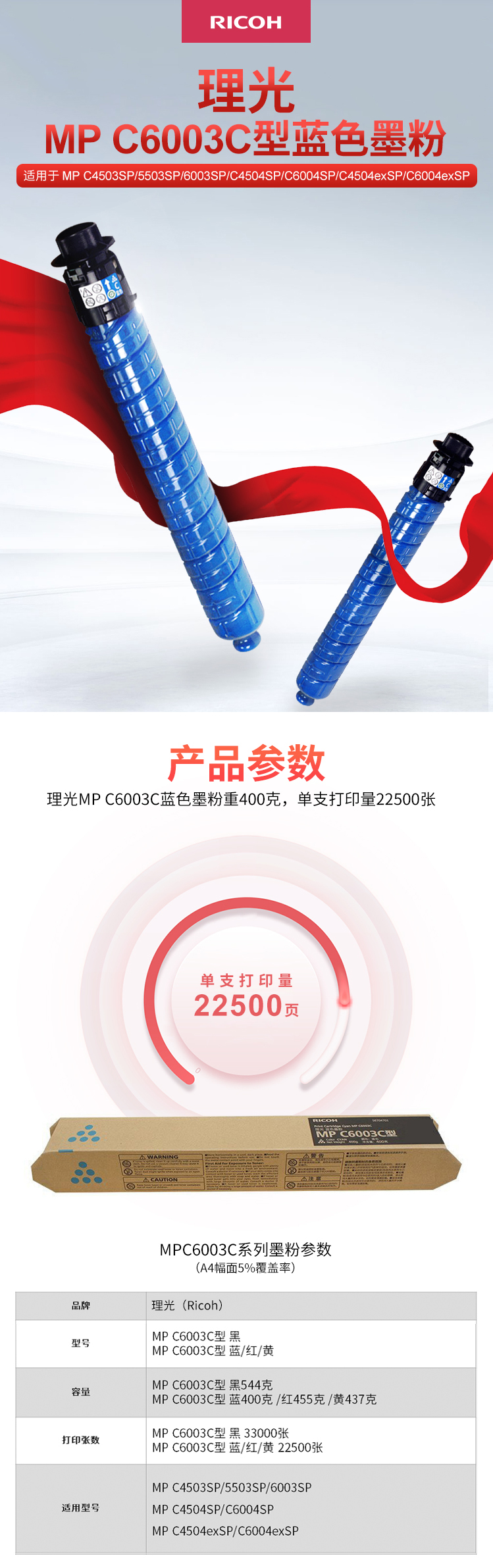 • 商品名稱:理光(RICOH)MPC6003C型藍(lán)色碳粉盒 印量約22500頁