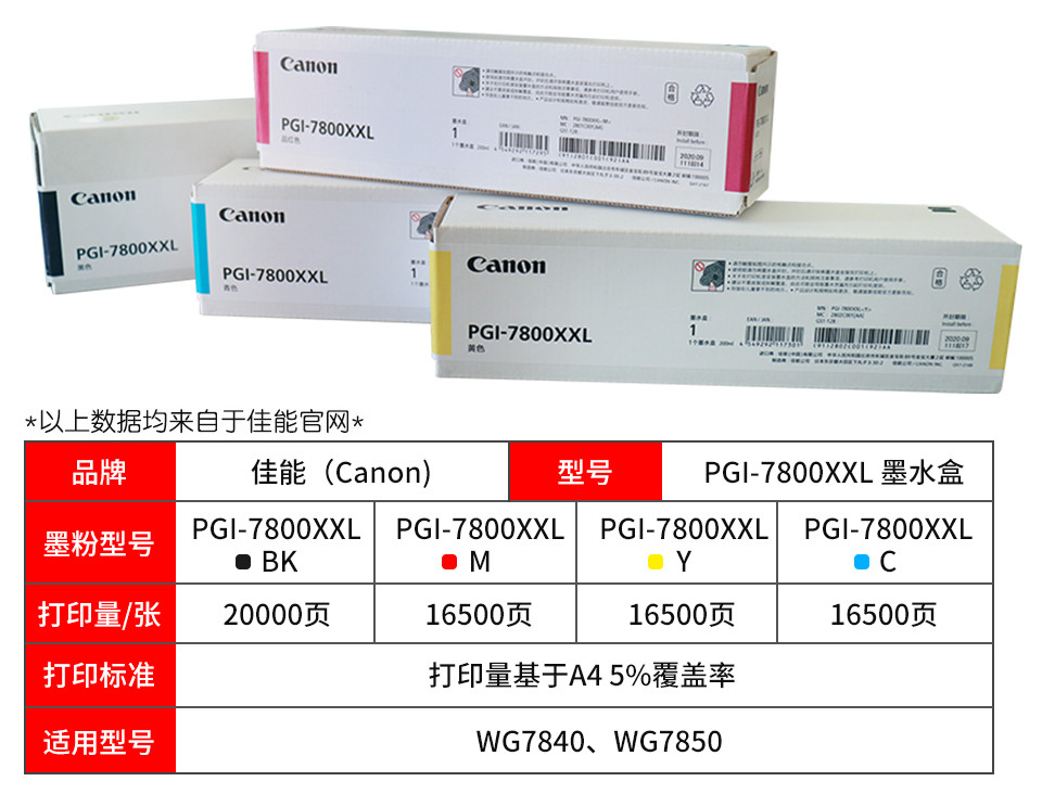 • 商品名稱:佳能(Canon)PGI-7800XXL C 青色墨水 大容量 約16500頁 適用于佳能WG7840/7850