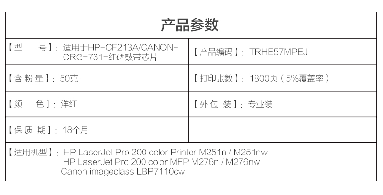 • 商品名稱:天威 CF213A 硒鼓帶芯片商用裝(TRHF41MPSYJ) 1800頁(yè) 洋紅色 / 適用于HP LaserJet Pro 200 color M251nw/M276 Canon Laser Shot LBP 7100/7110 Canon i-Sensys MF 8230 Canon i-Sensys MF 8280