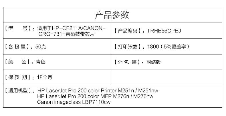 • 商品名稱:天威 CF211A 硒鼓帶芯片商用裝(TRHF40CPSYJ) 1800頁 青色 / 適用于HP LaserJet Pro 200 color M251nw/M276 Canon Laser Shot LBP 7100/7110 Canon i-Sensys MF 8230 Canon i-Sensys MF 8280