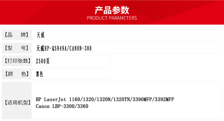 • 商品名稱:天威 Q5949A 硒鼓新版專業(yè)裝(TFH082BPEJ) 2500頁(yè) 黑色 / 適用于HP LaserJet 1160/1160le/1320/1320n/1320nw/1320t/1320tn/3390MFP/3392MFP; Canon LBP-3300/3360.