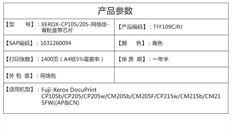 • 商品名稱:天威 CP105/205 硒鼓帶芯片專業(yè)裝(TFF153CPRJ) 1400頁 青色 / 適用于Fuji-Xerox DocuPrint CP105A/CP205/CP205w/CM205A/CM205F/CP215w/CM215A/CM215FW((AP&CN)