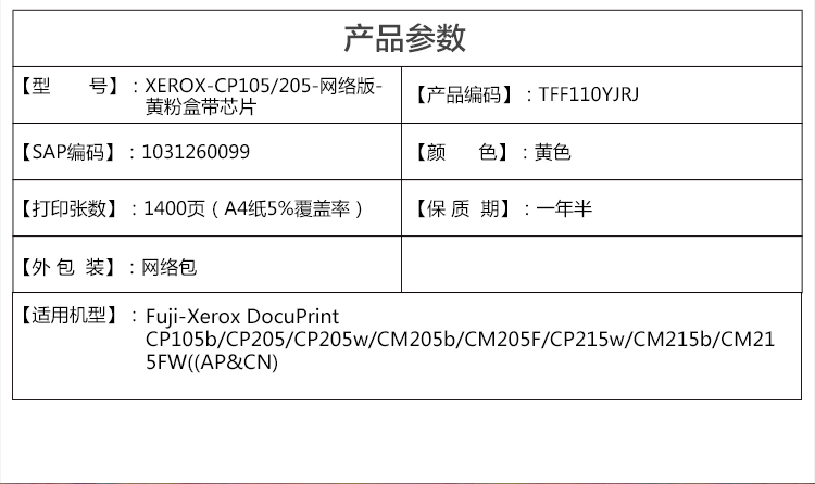 • 商品名稱:天威 CP105/205 硒鼓帶芯片專業(yè)裝(TFF154YPRJ) 1400頁 黃色 / 適用于Fuji-Xerox DocuPrint CP105A/CP205/CP205w/CM205A/CM205F/CP215w/CM215A/CM215FW((AP&CN)