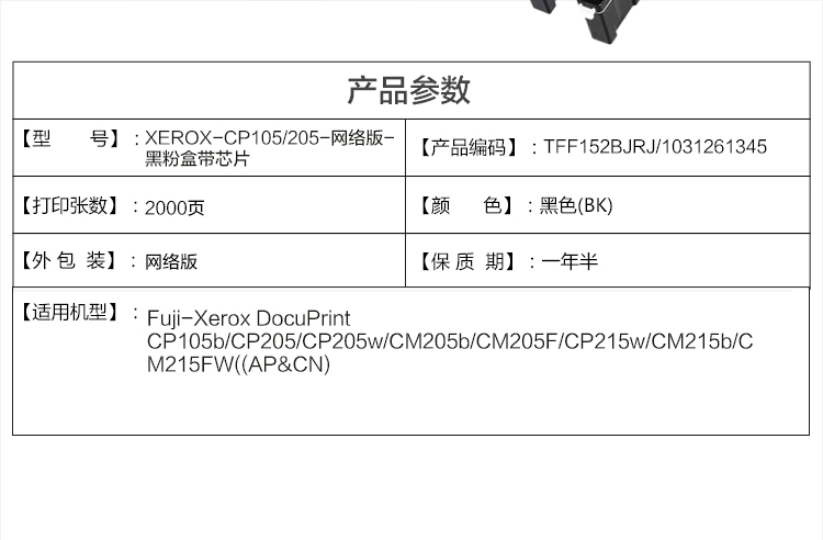 • 商品名稱:天威 CP105/205 硒鼓帶芯片專業(yè)裝(TFF152BPRJ) 2000頁 黑色 / 適用于Fuji-Xerox DocuPrint CP105A/CP205/CP205w/CM205A/CM205F/CP215w/CM215A/CM215FW((AP&CN)