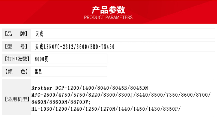 - 商品名稱:天威 3600 粉盒新版專業(yè)裝(TFB255BPEJ) 8000頁 黑色 / 適用于Brother DCP-1200/1400/8040/8045B/8045DN; MFC-2500/4750/5750/8220/8300/8300J/8440/8500/7350 /8600/8700/8460N/8860DN/8870DW; HL-1030/1200/1240/1250/1270N/1440/