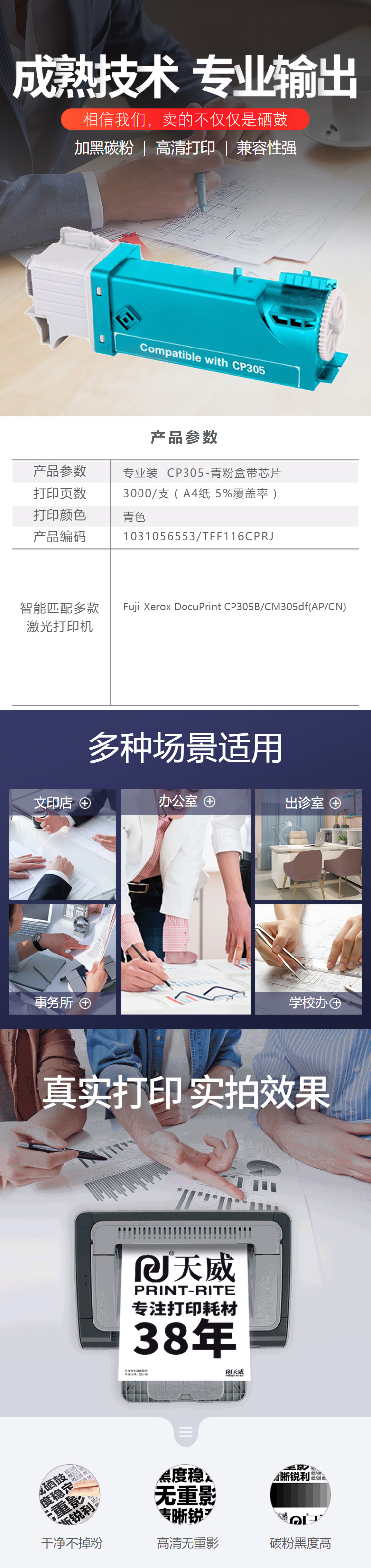 • 商品名稱:天威 CP305 粉盒帶芯片專業(yè)裝(TFF116CPRJ) 3000頁 青色 / 適用于Fuji-Xerox DocuPrint CP305B/CM305df(AP/CN)