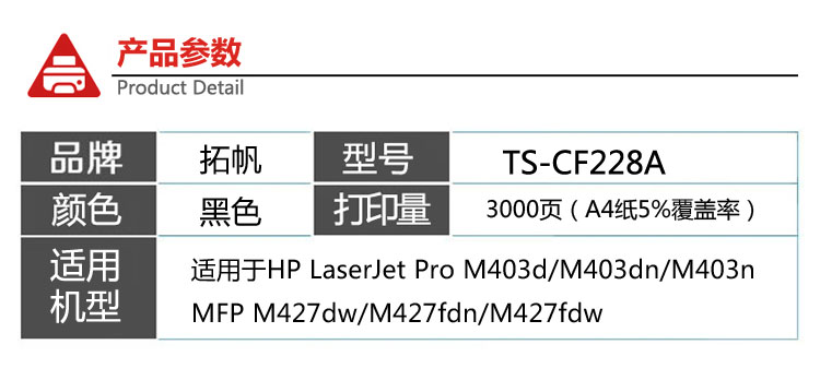 • 商品名稱:拓帆(TUOSAIL)TS-CF228A黑色硒鼓 適用M403DM403DNM427DW 打印量3000頁