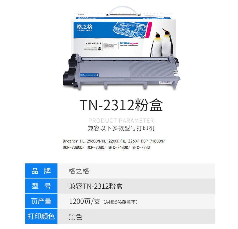 • 商品名稱:格之格 TN-2312黑色粉盒 適用兄弟7080d硒鼓 7380 7880dn 2260dn tn2312 tn2325打印機 單支裝