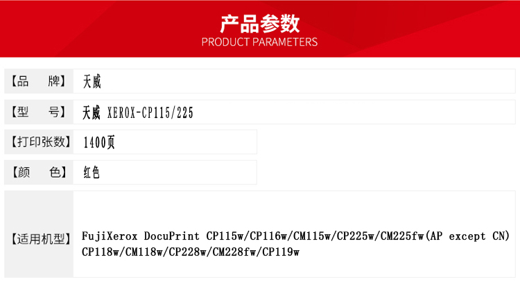 • 商品名稱:天威 CP115/225 粉盒帶芯片專業(yè)裝(TFF162MPRJ) 1400頁 洋紅色 / 適用于FujiXerox DocuPrint CP115w/CP116w/CM115w/CP225w/CM225fw(AP except CN)CP118w/CM118w/CP228w/CM228fw/CP119w