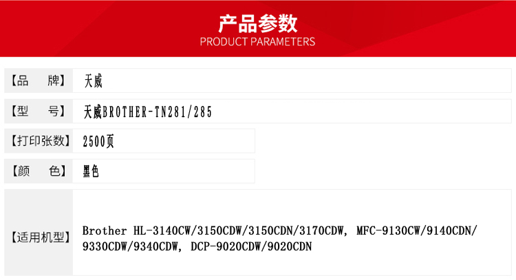 天威 TN281/285 硒鼓專業(yè)裝(TFB279BPEJ) 2500頁 黑色 / 適用于Brother HL-3140CW/3150CDW/3150CDN/3170CDW, MFC-9130CW/9140CDN/ 9330CDW/9340CDW, DCP-9020CDW/9020CDN (Worldwide)