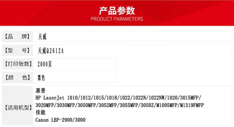 - 商品名稱:天威 2612 加粉樂新版專業(yè)裝(TFH304BPEJ) 2000頁 黑色 / 適用于HP LaserJet 1010/1012/1015/1018/1022/1022N/1022NW/1020/3015MFP/3020MFP/ 3030MFP/3050MFP/3052MFP/3055MFP/3050Z/M1005MFP/M1319FMFP Canon LBP-2900/3000