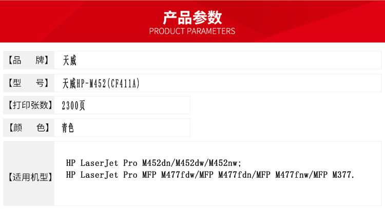 • 商品名稱(chēng):天威 CF411 硒鼓帶芯片專(zhuān)業(yè)裝(TFH089CPEJ) 2300頁(yè) 青色 / 適用于HP LaserJet Pro M452dn/M452dw/M452nw; HP LaserJet Pro MFP M477fdw/MFP M477fdn/MFP M477fnw/MFP M377.