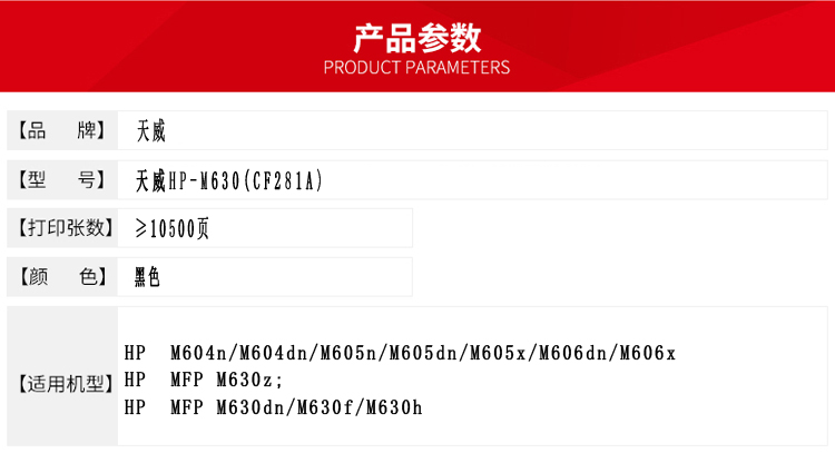 - 商品名稱:天威 CF281A 硒鼓帶芯片專業(yè)裝(TRHG23BPEJ) ≥10500頁(yè) 黑色 / 適用于HP LaserJet Enterprise M604n/M604dn/M605n/M605dn/M605x/M606dn/M606x HP LaserJet Enterprise flow MFP M630z; HP LaserJet Enterprise MFP M630dn/M630f/M630h