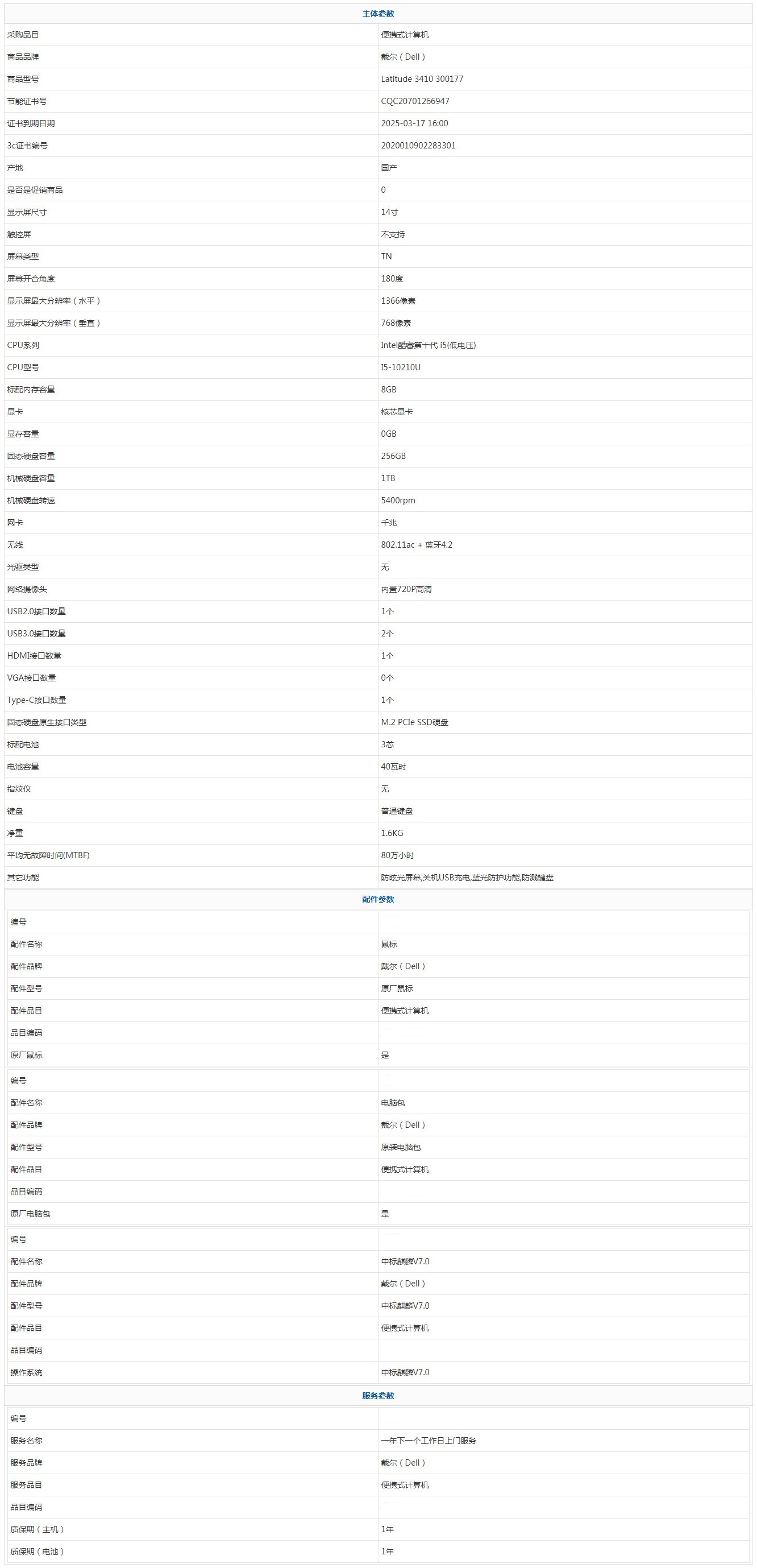 - 商品名稱(chēng):戴爾(Dell) Latitude 3410 300177 Intel酷睿第十代 i5(低電壓) I5-10210U 8GB 1TB 256GB 中標(biāo)麒麟V7.0 14寸 1年