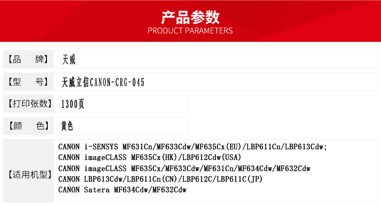 • 商品名稱:立信 CRG-045 硒鼓帶芯片天威立信裝(TFC242BYNJ) 1400頁 黑色 適用于CANON i-SENSYS LBP611Cn/LBP613Cdw; CANON i-SENSYS MF631Cn/MF633Cdw/MF635Cx(EU) CANON imageCLASS MF634Cdw/MF632Cdw CANON imageCLASS LBP612Cdw(USA) CANON im