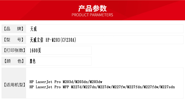 立信 CF230A 粉盒帶芯片天威立信裝(TFH242BYNJ) 1600頁(yè) 黑色 適用于HP LaserJet Pro M203d/M203dn/M203dw HP LaserJet Pro MFP M227d/M227dn/M227dw/M227fw/M227fdn/M227fdw/M227sdn