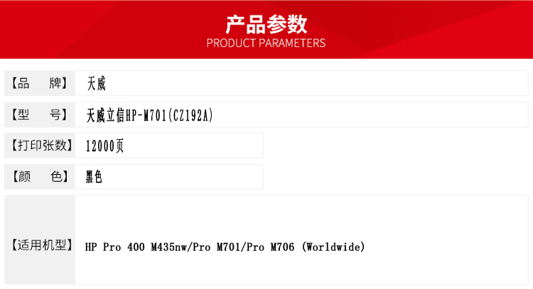 • 商品名稱:立信 192 硒鼓帶芯片天威立信裝(TRHF33BYNJ) 12000頁 黑色 適用于HP Pro 400 M435nw/Pro M701/Pro M706 (Worldwide)