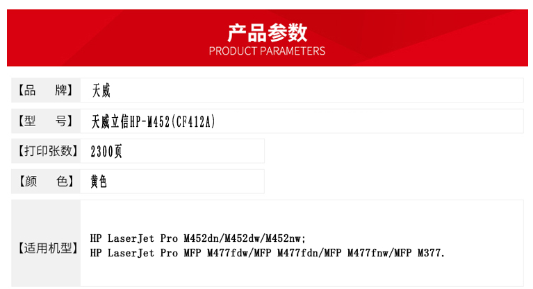 • 商品名稱:立信 CF412A 硒鼓帶芯片 天威立信裝(TFH090YYNJ) 2300頁 黃色 適用于HP LaserJet Pro M452dn/M452dw/M452nw; HP LaserJet Pro MFP M477fdw/MFP M477fdn/MFP M477fnw/MFP M377.