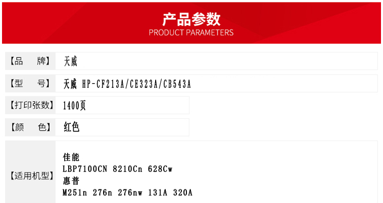 - 商品名稱:立信 CF213A 硒鼓帶芯片 天威立信裝(TRHE58YYNJ) 1400頁(yè) 洋紅色 適用于HP LaserJet Pro 200 color Printer M251n / M251nw HP LaserJet Pro 200 color MFP M276n/M276nw Canon Laser Shot LBP7110cw Canon imageclass LBP7110cw/LBP7100