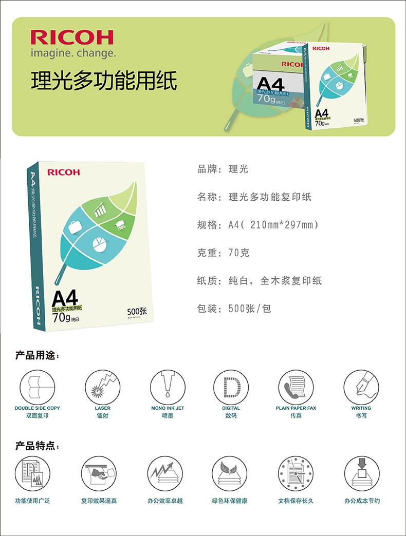 • 商品名稱:理光(Ricoh)70g A4 復(fù)印紙 多功能用紙 500張/包 5包1箱