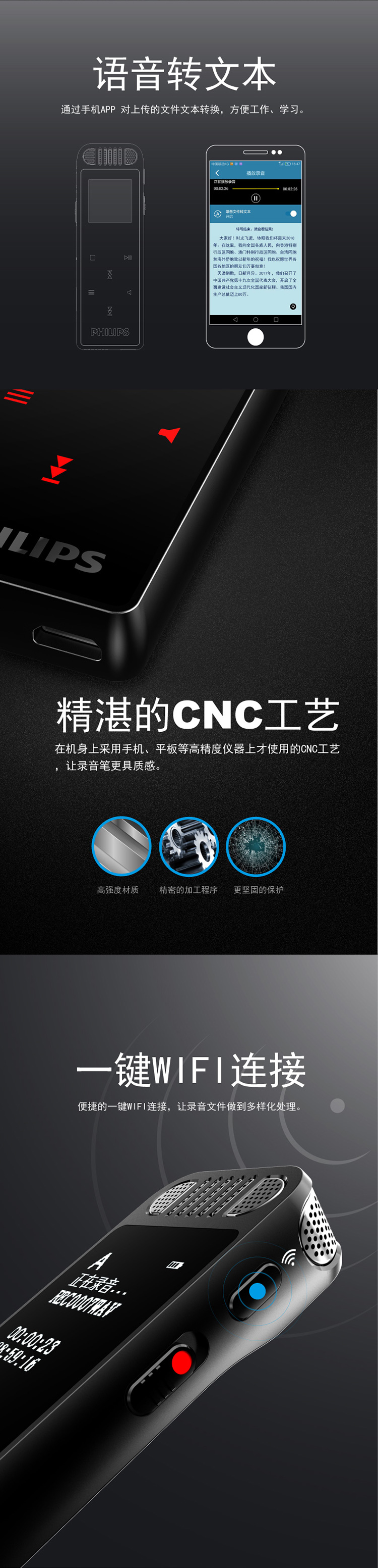 飛利浦(PHILIPS)VTR8060 16GB 會(huì)議 學(xué)習(xí)記錄 WIFI 語音轉(zhuǎn)文本 APP文件傳輸分享 智能數(shù)字降噪錄音筆