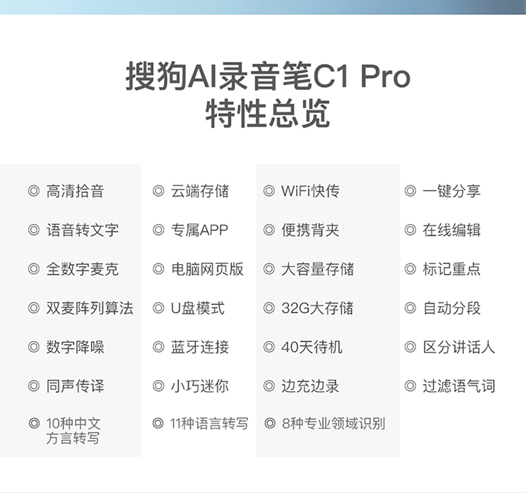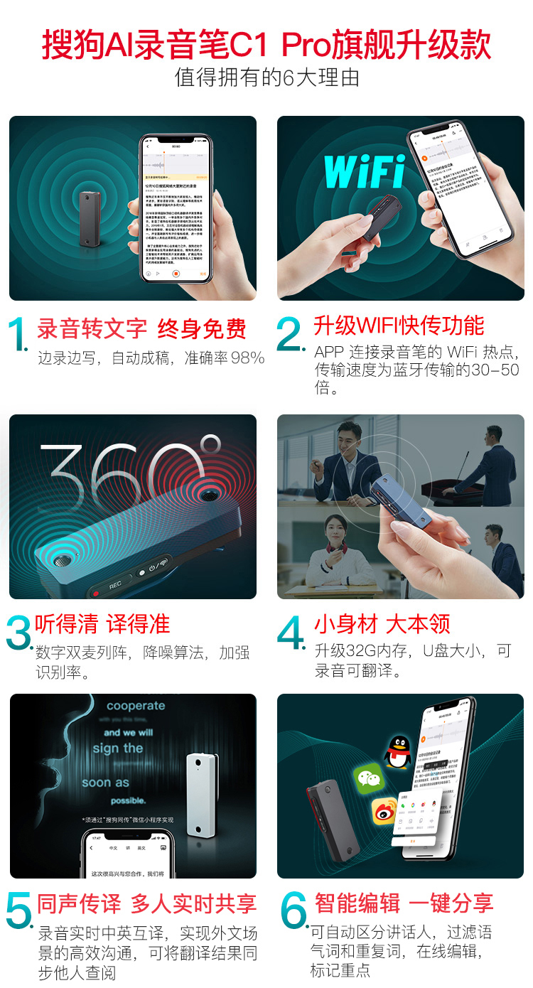 • 商品名稱:搜狗 Sogou AI智能錄音筆C1 Pro 終身免費轉(zhuǎn)文字 高清錄音 32G 同聲傳譯 WIFI快傳 超長續(xù)航