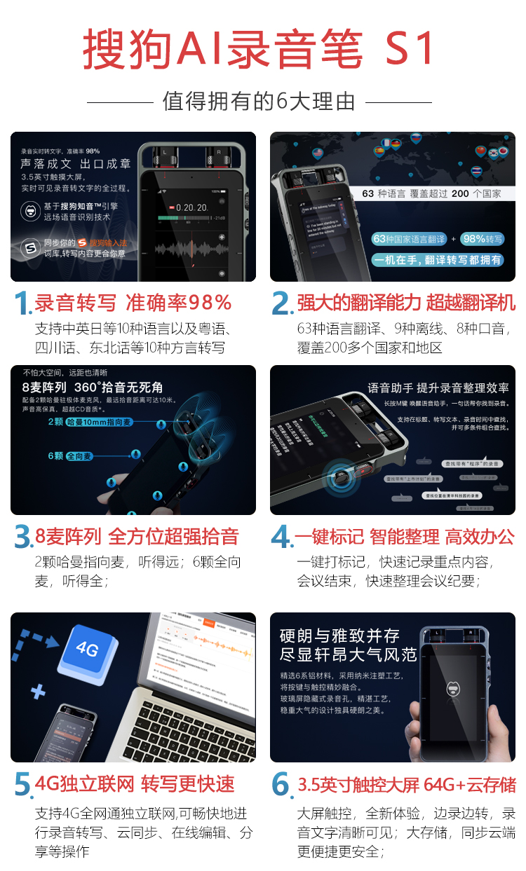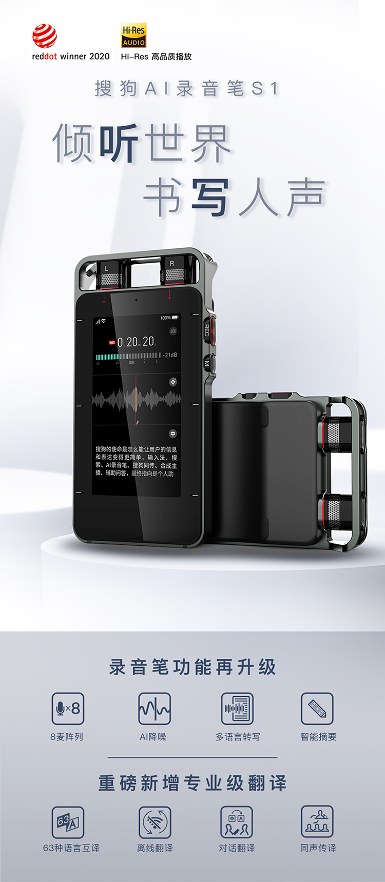 搜狗Sogou AI智能錄音筆S1 多語(yǔ)言翻譯機(jī) 終身免費(fèi)轉(zhuǎn)寫 錄音轉(zhuǎn)文字8麥?zhǔn)耙?高清降噪
