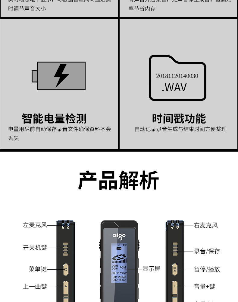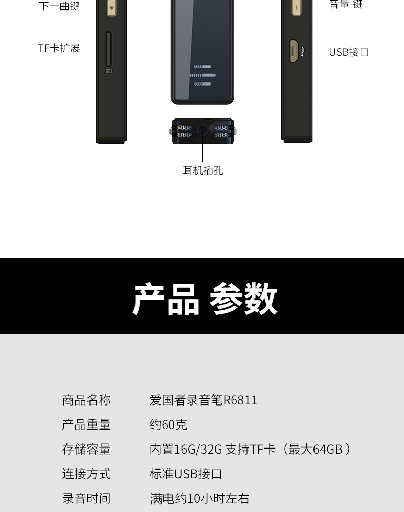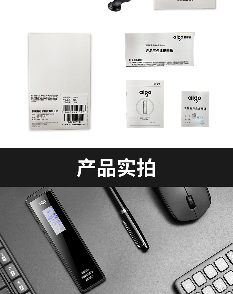 • 商品名稱:愛國者(aigo) 錄音筆 R6811 16G一鍵錄音擴(kuò)容智能專業(yè)微型高清降噪錄音器 學(xué)習(xí)會(huì)議培訓(xùn)采訪