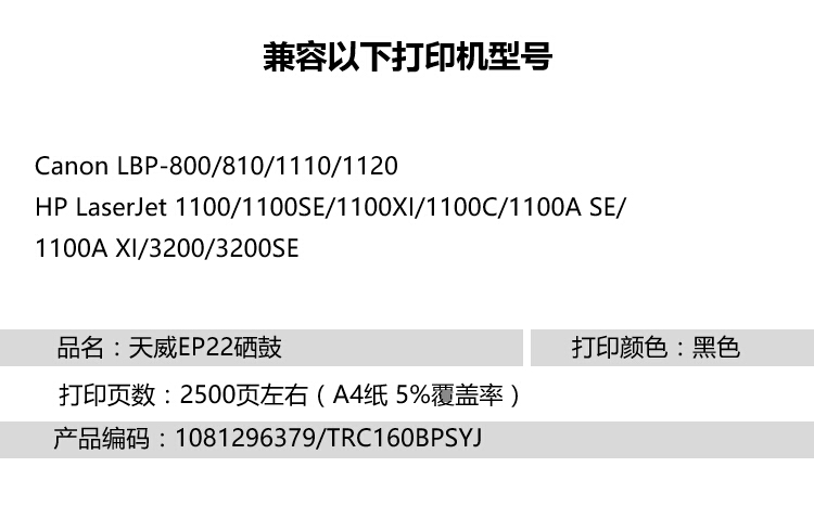 天威 EP22 硒鼓商用裝(TRC160BPSYJ) 2500頁 黑色 適用于Canon LBP-800/810/1110/1120 HP LaserJet 1100/1100SE/1100XI/1100C/1100A SE/1100A XI/3200/3200SE