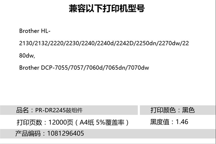 • 商品名稱:天威 DR2245 鼓組件商用裝(TFB283BPSYJ) 12000頁 黑色 適用于Brother HL-2130/2132/2220/2230/2240/2240C/2242C/2250dn/2270dw/2280dw, Brother DCP-7055/7057/7060C/7065dn/7070dw Brother MFC-7360n/7460dn/7470C/7860dw