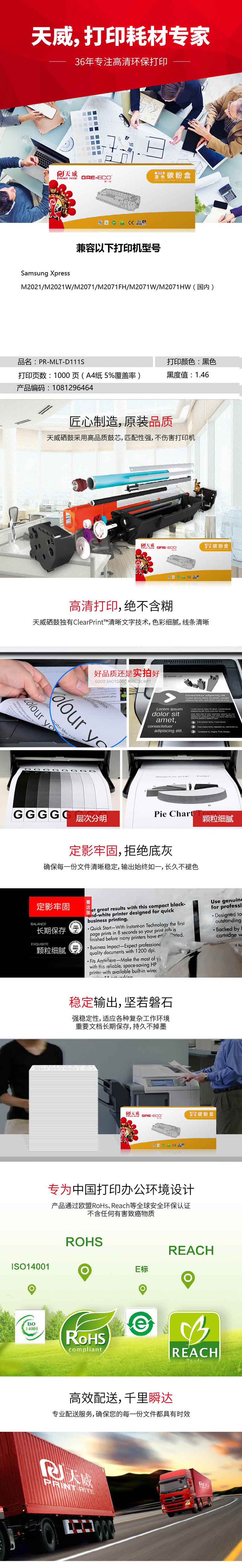 • 商品名稱:天威 D111S 硒鼓帶芯片商用裝(TFSE67BPSYJ) 1000頁 黑色 適用于Samsung Xpress M2021/M2021W/M2071/M2071FH/M2071W/M2071HW(國內(nèi))