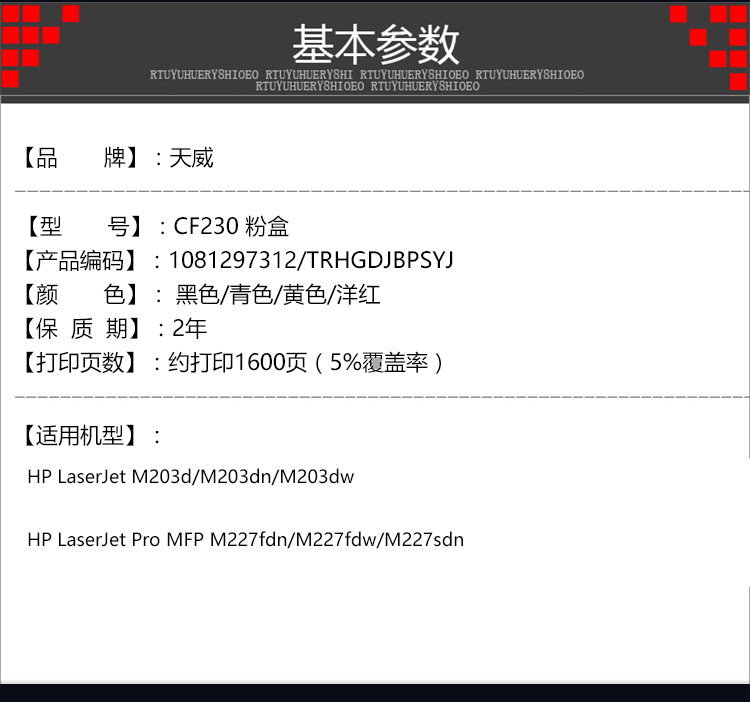 • 商品名稱:天威 CF230 粉盒帶芯片商用裝(TRHGDJBPSYJ) 1600頁 黑色 適用于HP LaserJet M203d/M203dn/M203dw HP LaserJet Pro MFP M227fdn/M227fdw/M227sdn