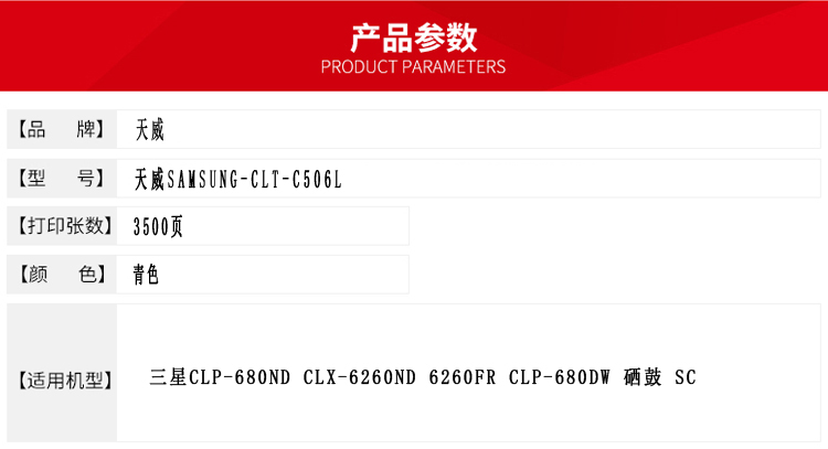 • 商品名稱:天威 CLT-C506L 青色硒鼓帶芯片專業(yè)裝 印量約3500頁(yè)