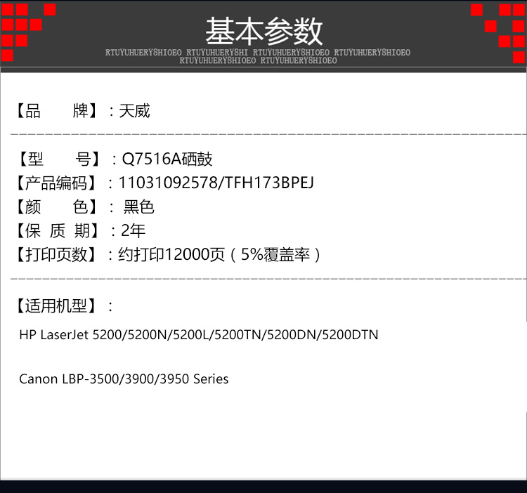 • 商品名稱:天威 Q7516A 黑色硒鼓帶芯片新版專業(yè)裝 印量約12000頁