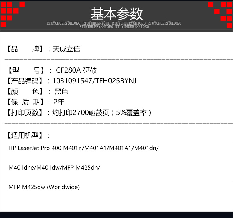 • 商品名稱:天威立信 CF280A(TFH025BYNJ) 黑色硒鼓帶芯片 印量約2700頁